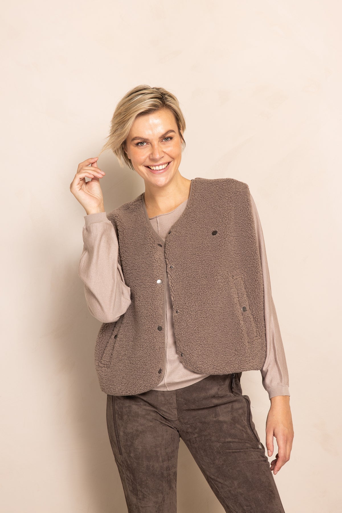 Die hüftlange Weste in Taupe überzeugt mit ihrem weichen Teddyfell-Look und einem klassischen Regular Fit. Der V-Ausschnitt und die Druckknopfleiste unterstreichen das schlichte, moderne Design, während Eingrifftaschen mit Druckknopfverschluss praktische Funktionalität bieten. Ein vielseitiges Kleidungsstück, das Komfort und lässige Eleganz perfekt verbindet.