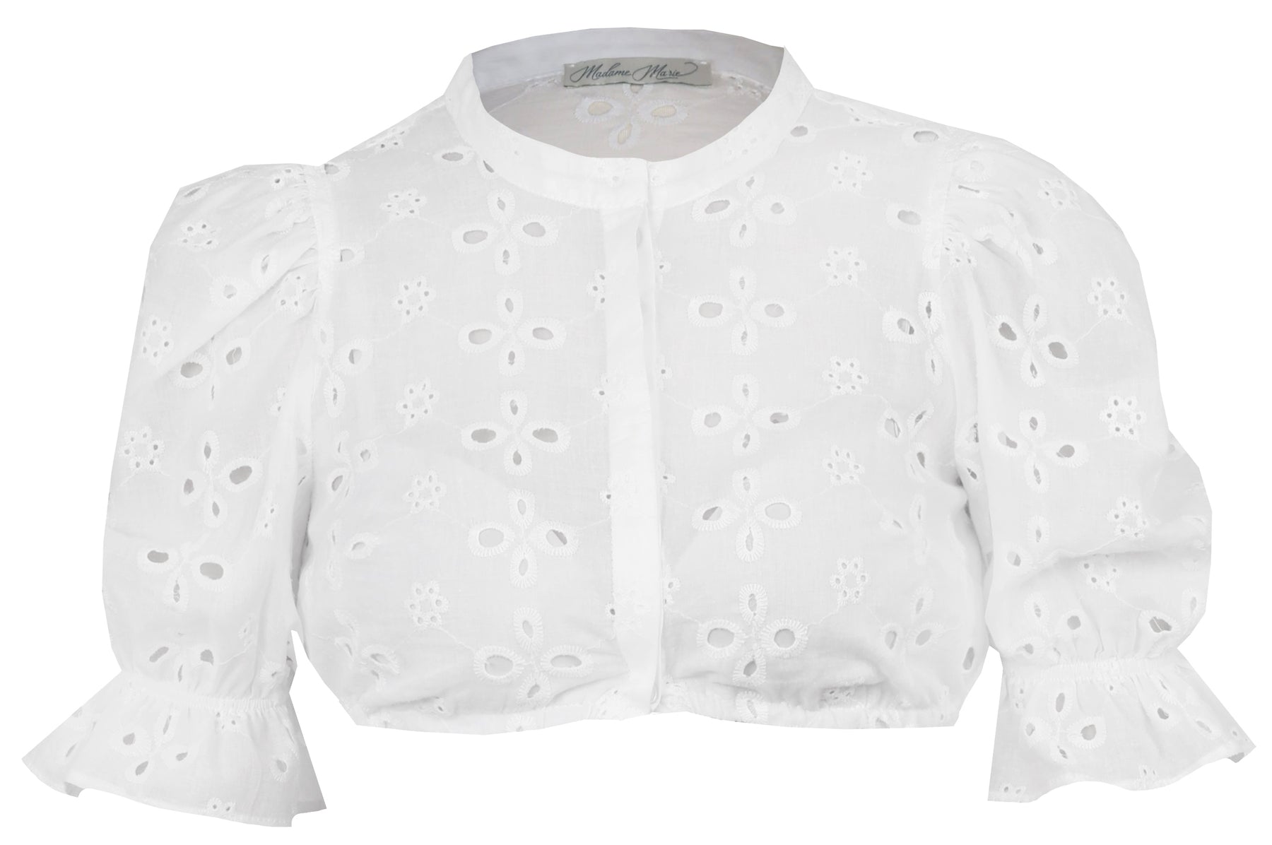 Die Dirndlbluse Ariselle von Madame Marie ist wie gemacht für Frauen, die Wert auf das Besondere legen. Aus reiner, angenehm weicher Baumwolle gefertigt, überzeugt sie mit zarten, floralen Lochstickereien, die dem Design eine leichte Transparenz und romantische Leichtigkeit verleihen.