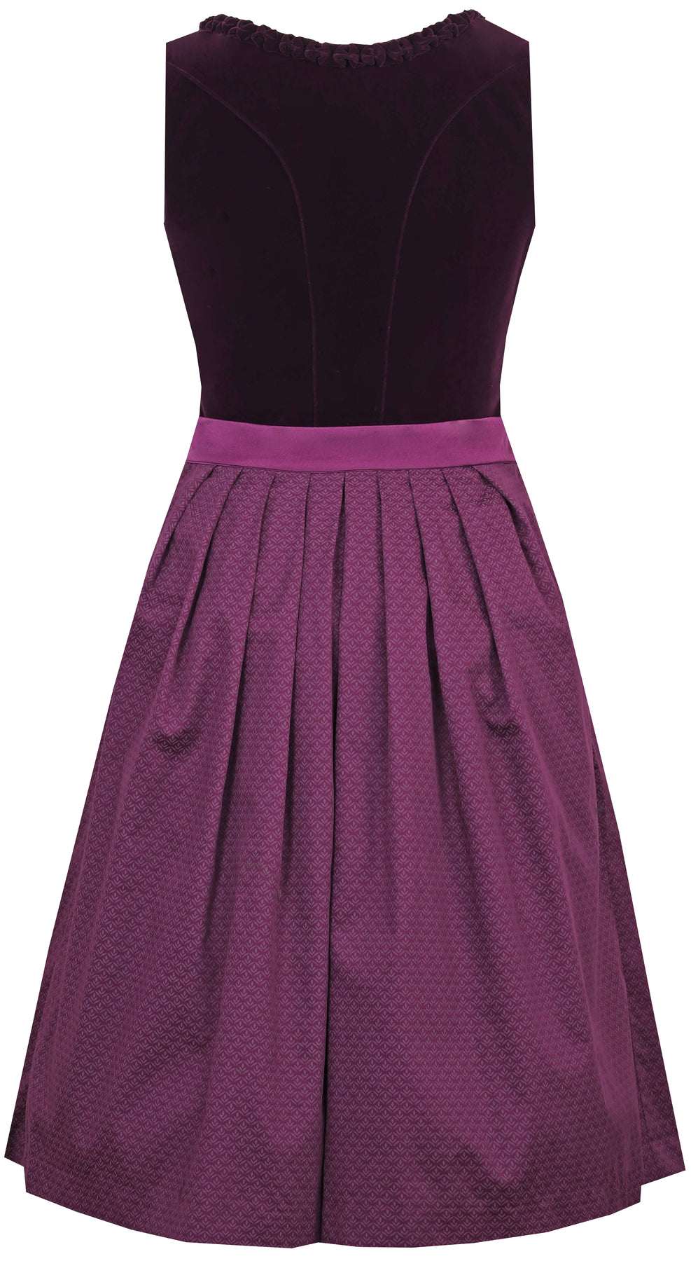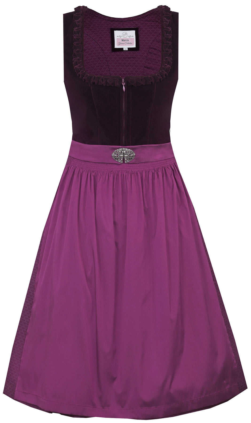 Dieses auffallende Dirndl in intensivem Brombeer-Ton begeistert durch edle Materialien und liebevolle Details. Das Mieder mit praktischem Reißverschluss wird von einer verspielten Froschmäulchen-Bordüre geschmückt, während die abnehmbare Schürze mit eleganter Schließe den Look harmonisch abrundet.